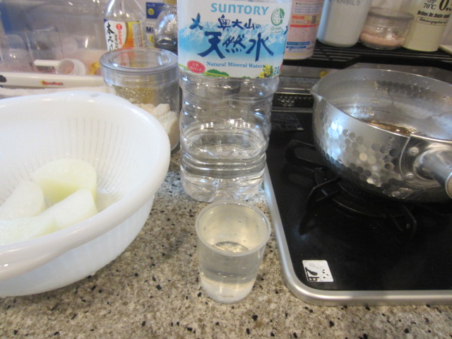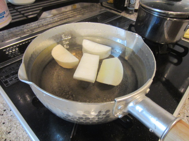 大根を下茹でします